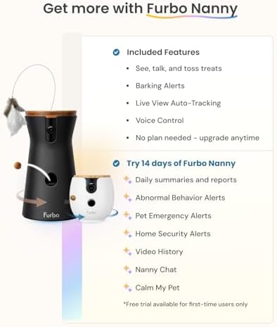 PEACE OF MIND AT HOME: Designed to watch over your pet, Furbo Nanny sends real-time alerts and smart insights, plus includes 3–7 days of video history so you can review what you missed. With continuous feature updates, it evolves to better understand your pet. (Important: This camera requires a paid subscription to Furbo Nanny.)