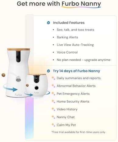 PEACE OF MIND AT HOME: Designed to watch over your pet, Furbo Nanny sends real-time alerts and smart insights, plus includes 3–7 days of video history so you can review what you missed. With continuous feature updates, it evolves to better understand your pet. (Important: This camera bundle requires a paid subscription to Furbo Nanny.)