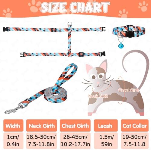 Adjustable Size: Neck girth 7.5”-11.8”, chest girth 10.6”-18.1”, collar 7.1″-11.4″, leash length 59”, please measure your cat’s neck and chest girth before you place your order